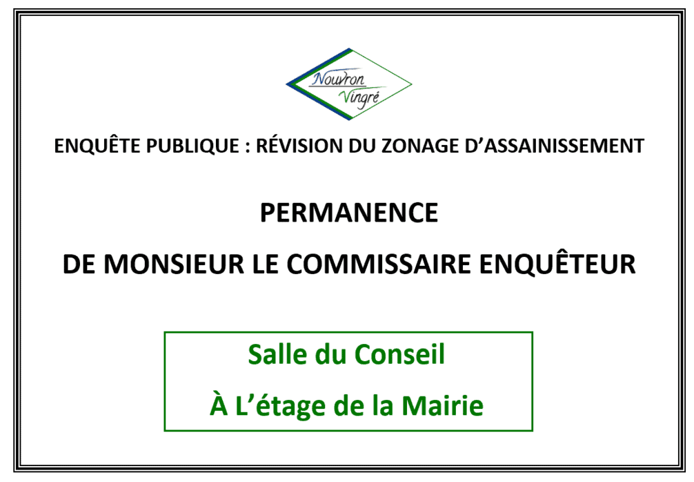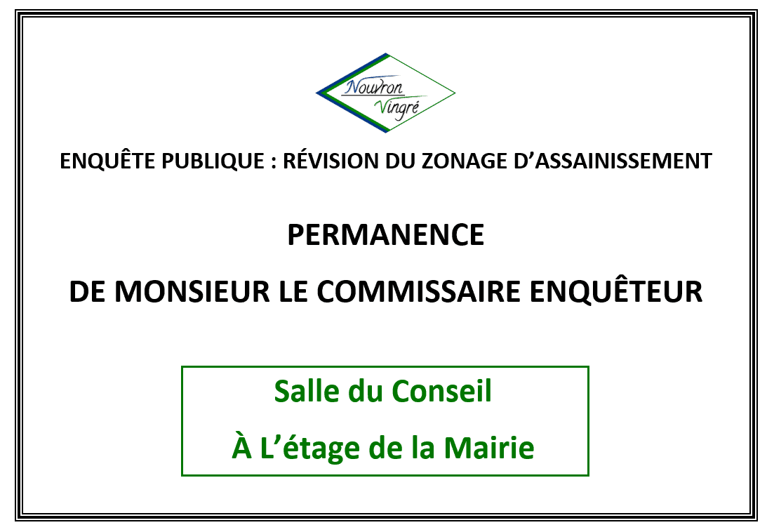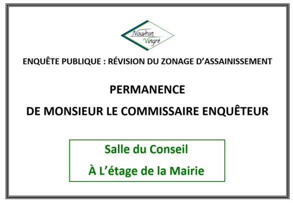 Dans le cadre de l’enquête publique relative à la révision du zonage d’assainissement, Monsieur le Commissaire Enquêteur tiendra une permanence samedi 30 octobre de 9h à 12h à la Mairie.