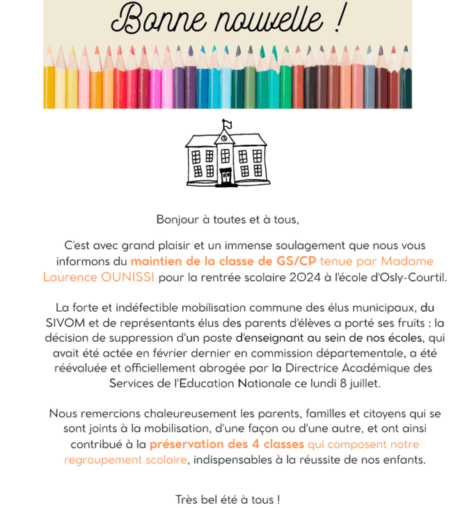 » Actualités » ◾️ MAINTIEN DE LA CLASSE DE GS/CP D’OSLY-COURTIL POUR LA RENTRÉE 2024 👨🏫