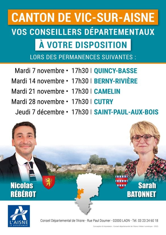 ➡️ Les élus départementaux du canton de Vic-sur-Aisne, Nicolas RÉBÉROT et Sarah BATONNET, viennent à votre rencontre.