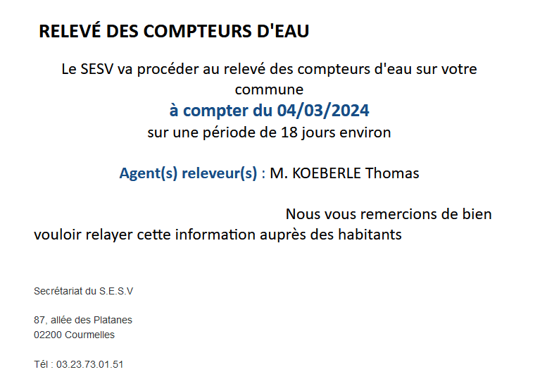 » Vie pratique » Infos pratiques » ◾️ RELEVÉ DES COMPTEURS D’EAU 💧