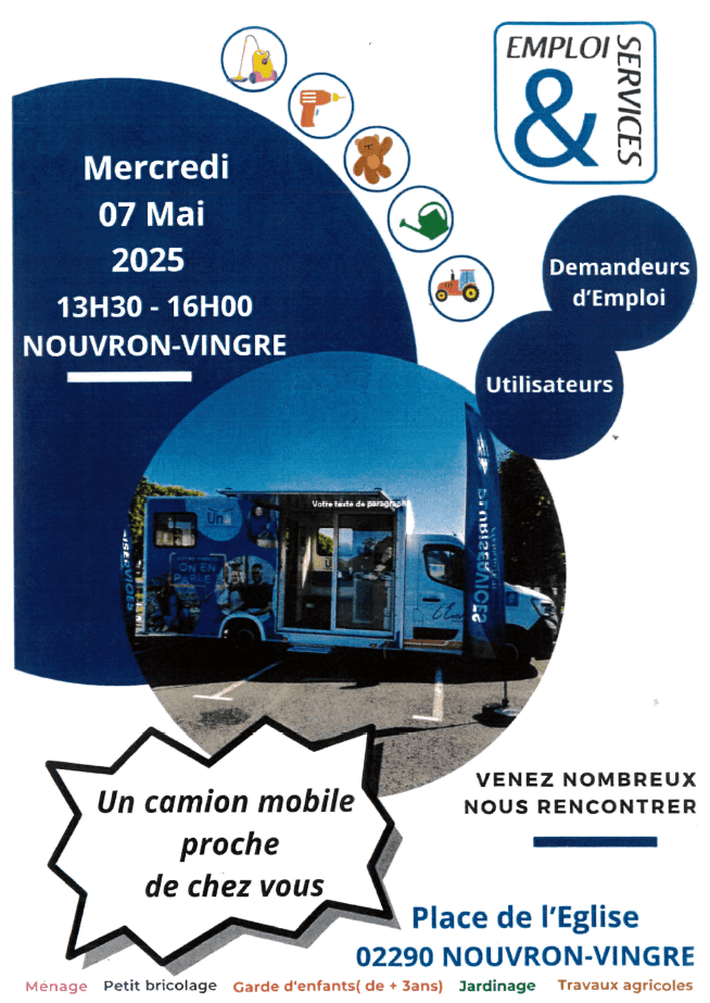 ➡️ Vous êtes demandeur d’emploi ou vous recherchez de la main d’œuvre pour vos petits travaux (ménage, bricolage, jardinage, etc…), vous pouvez aller à la rencontre de l’association qui se déplacera dans notre village :